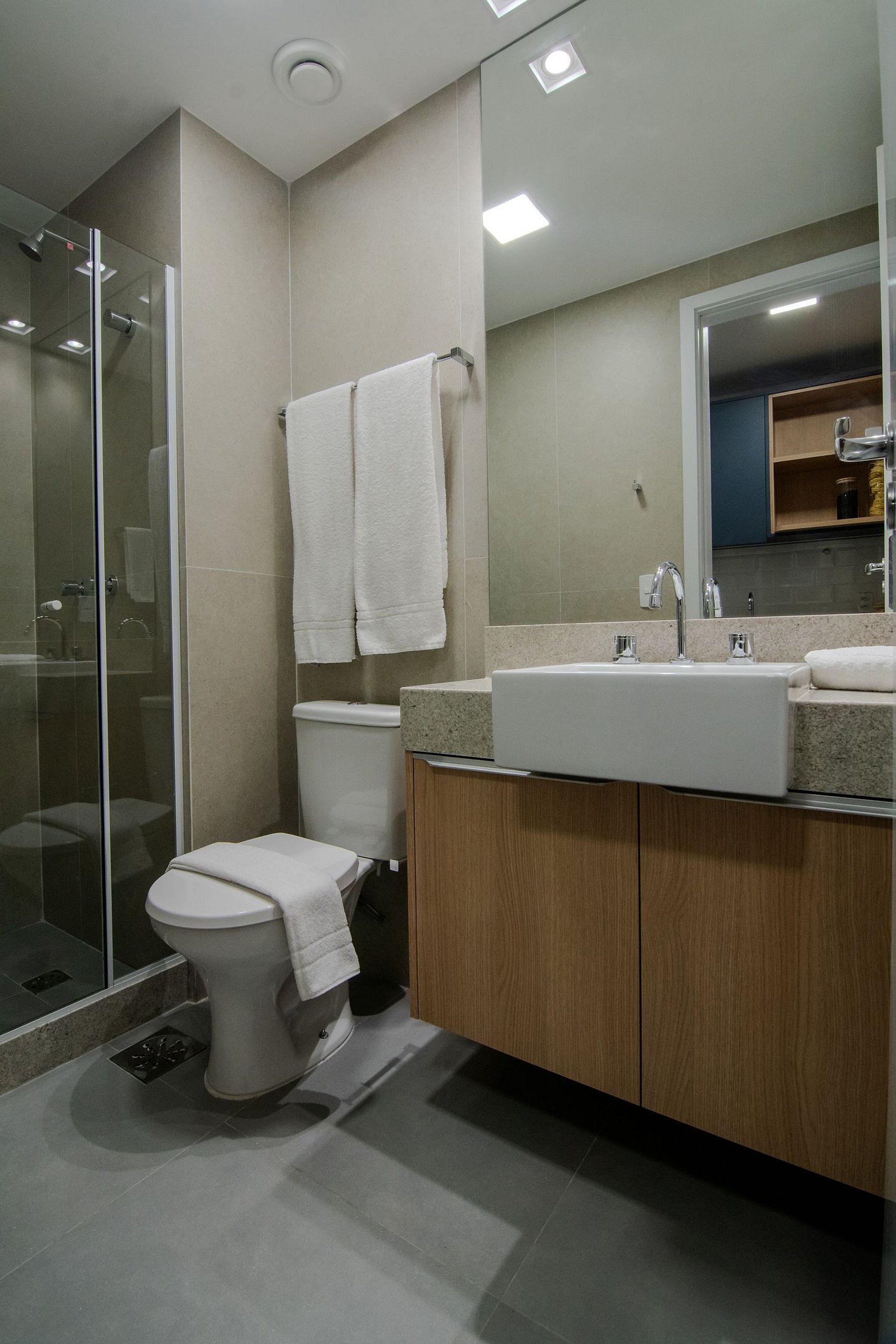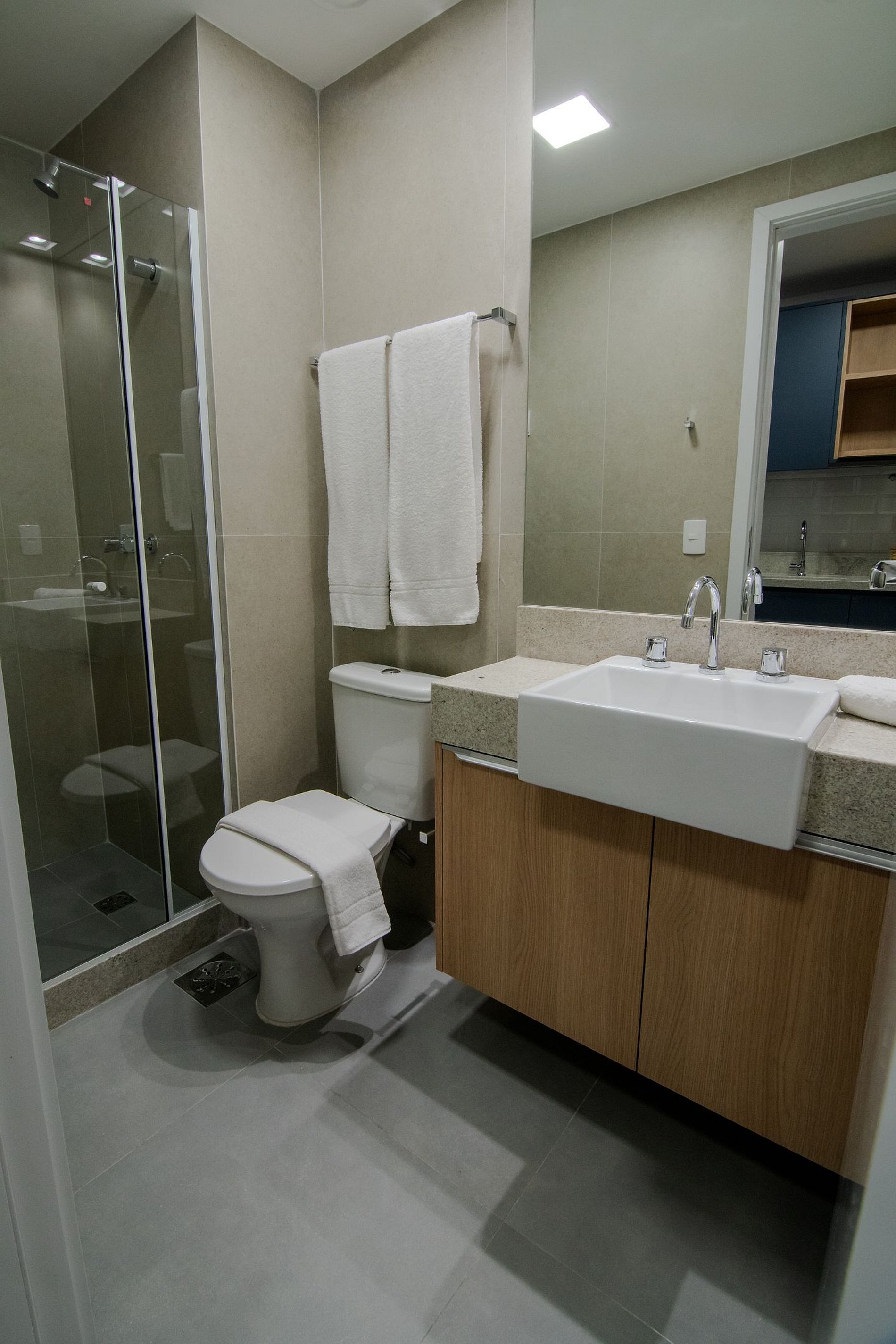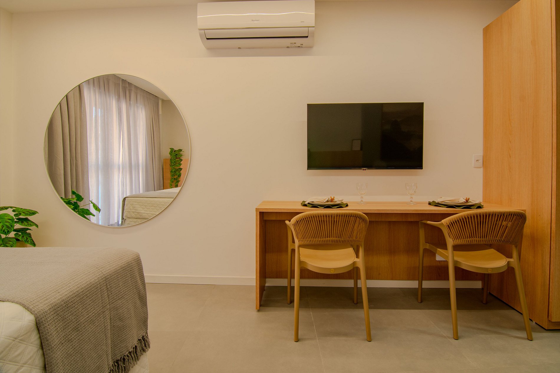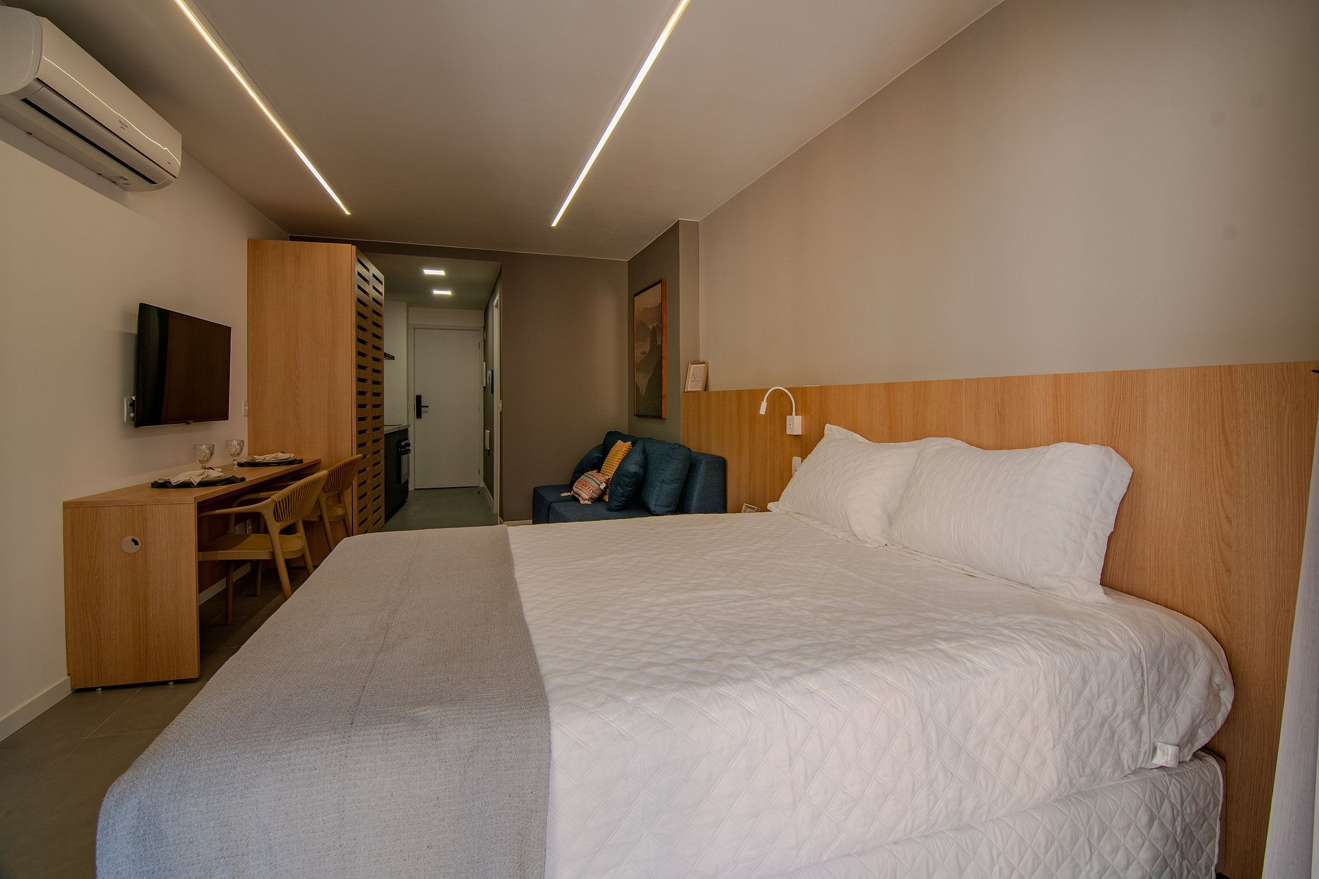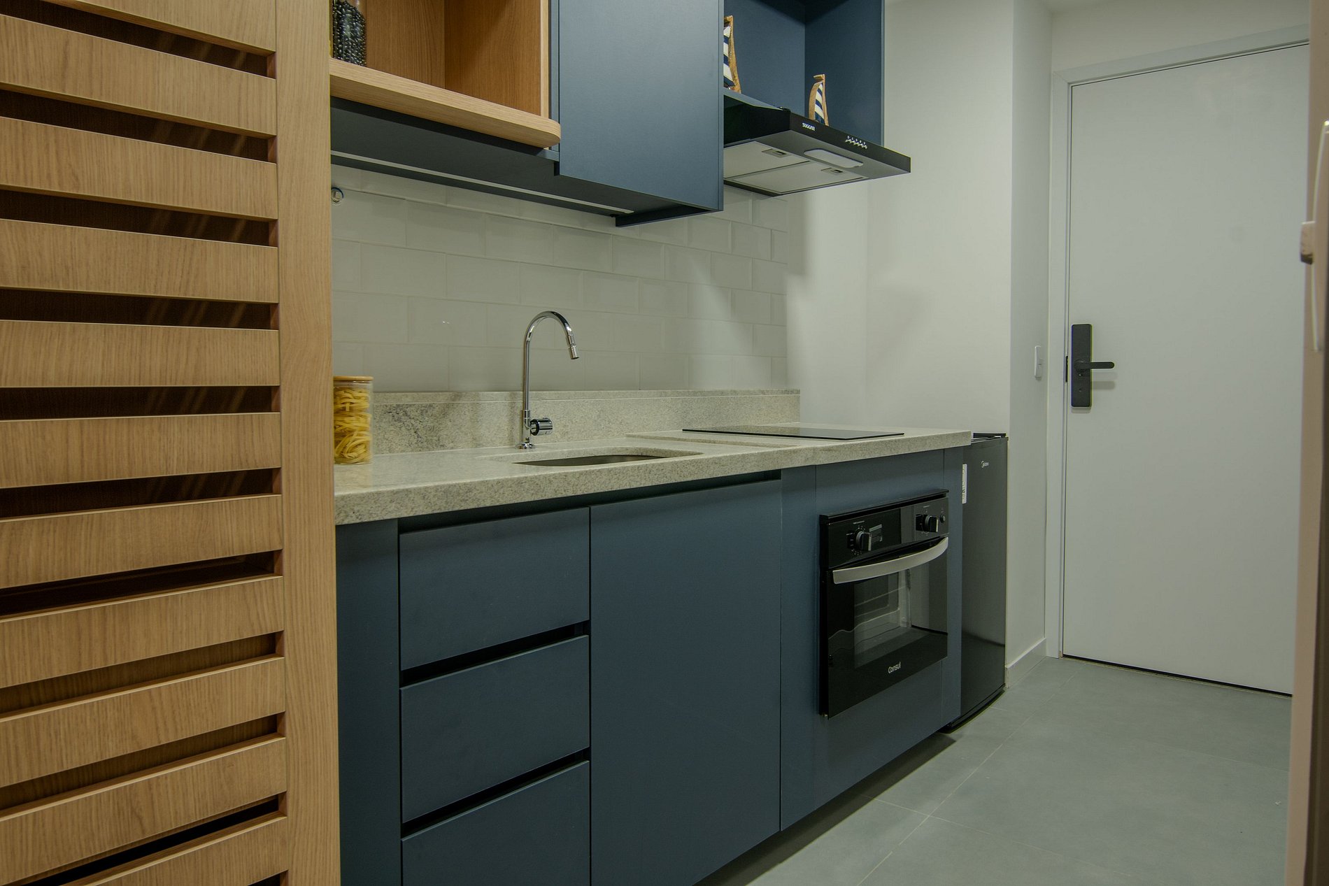 Apartamento executivo com cama queen size, TV de 43”, ar-condicionado, internet wifi e mesa de trabalho. Conta também com sofá e cozinha equipada com fogão de indução de 2 bocas, forno, frigobar, liquidificador, além de panelas, pratos, copos e talheres. Oferecemos enxoval completo com roupa de cama e toalhas de banho, secador de cabelo e amenities para sua comodidade. O empreendimento dispõe de áreas comuns encantadoras: piscina, academia, lounge externo no rooftop, cozinha compartilhada (uma extensão da cozinha do apartamento), espaço coworking, mini mercado autônomo (pagamento à parte), chopeira (pagamento à parte) e lavanderia compartilhada (pagamento à parte). Para maior praticidade, o self check-in é realizado de forma totalmente digital, com entrada no prédio por biometria facial e portas eletrônicas com envio de senha para acesso.