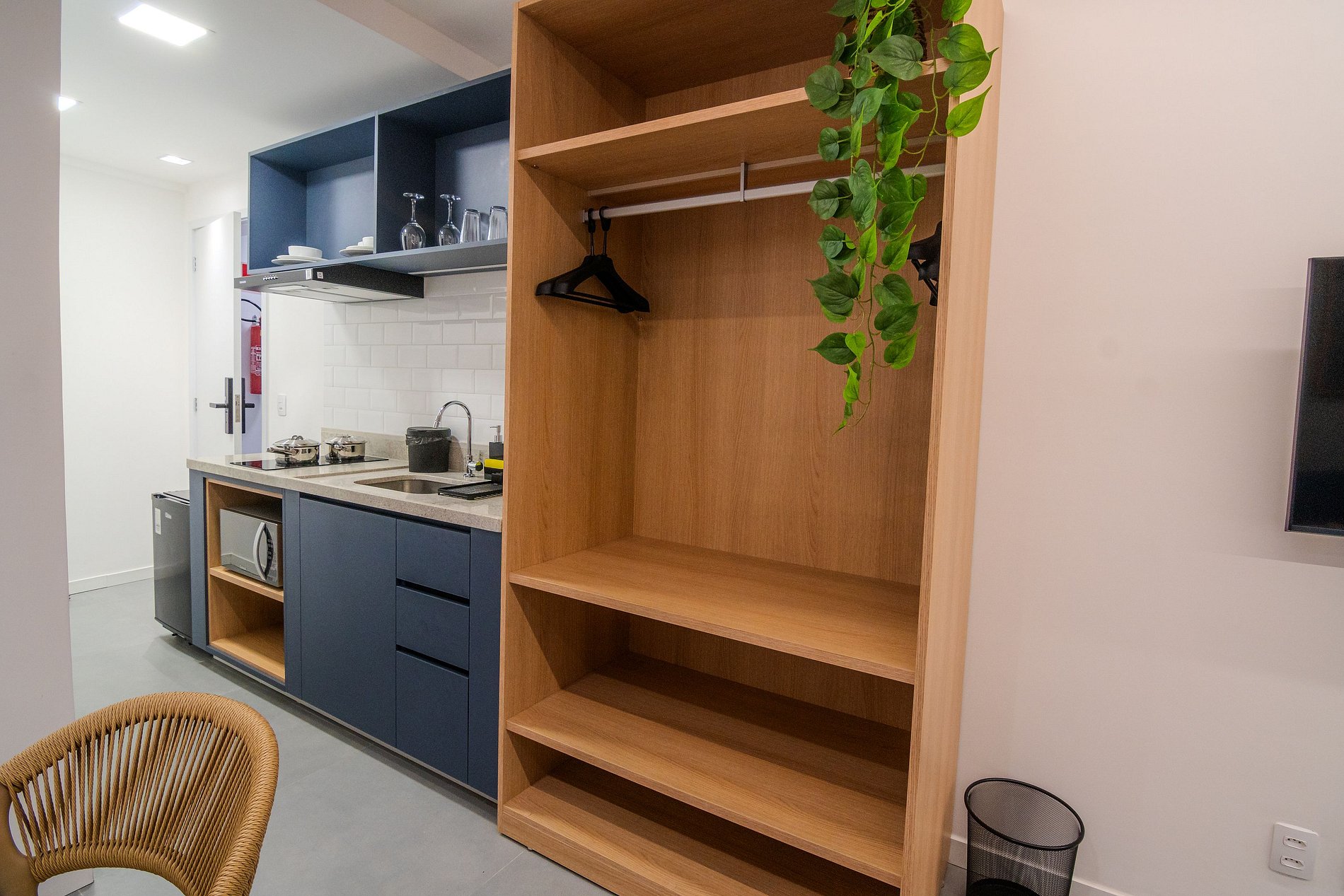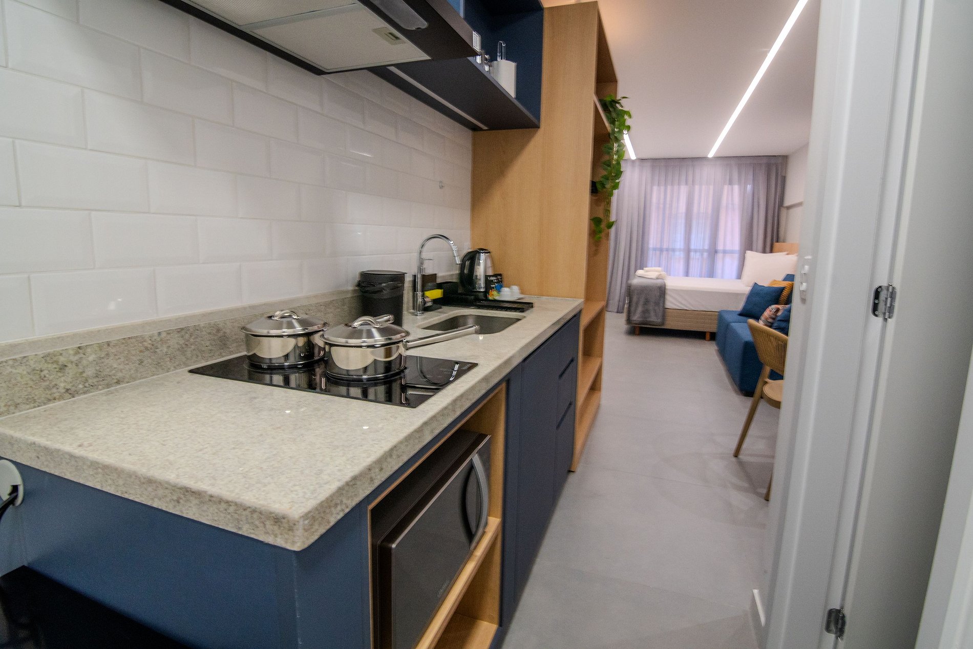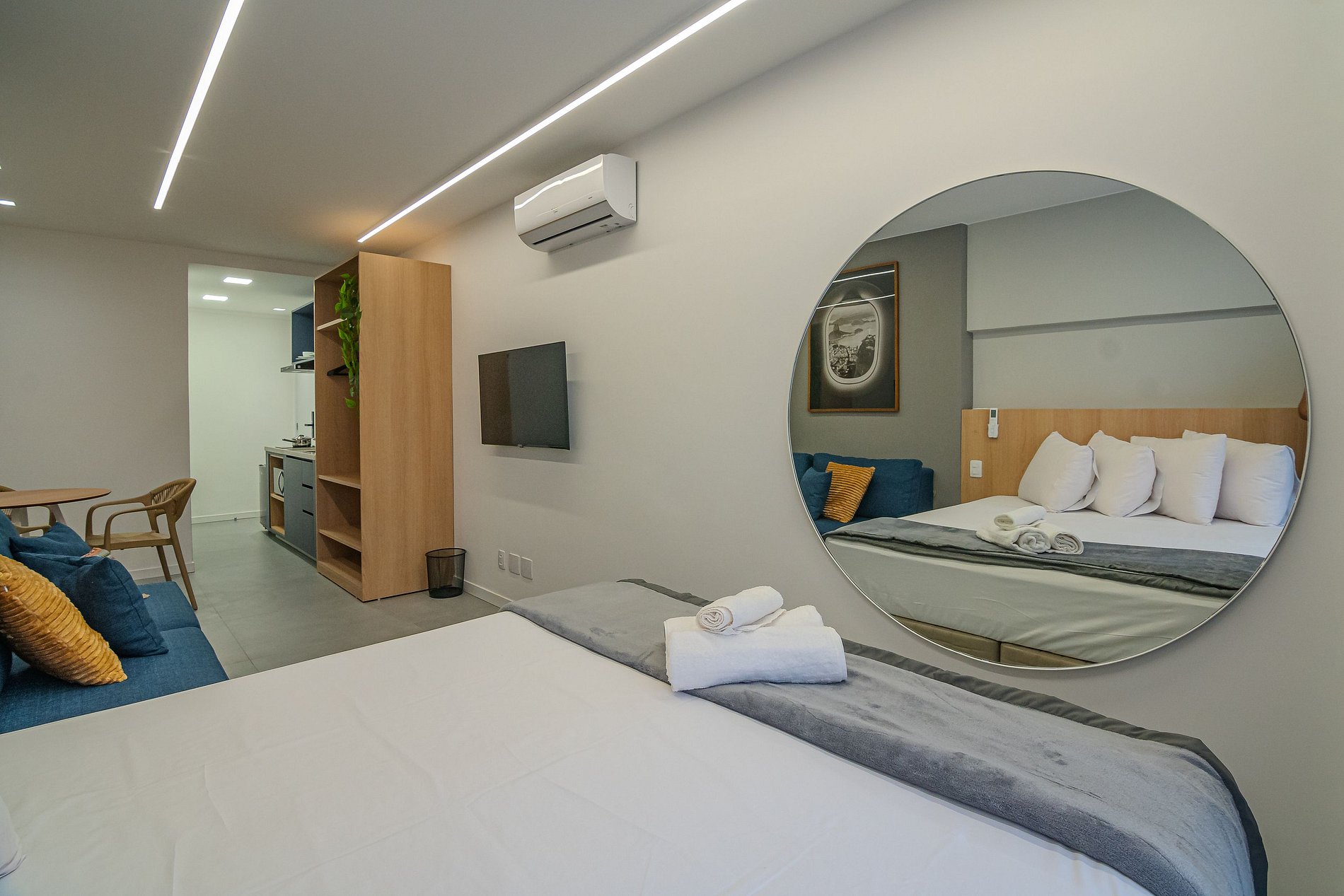 Apartamento executivo com cama queen size, TV de 43”, ar-condicionado, internet wifi e mesa de trabalho. Conta também com sofá e cozinha equipada com fogão de indução de 2 bocas, forno, frigobar, liquidificador, além de panelas, pratos, copos e talheres.
