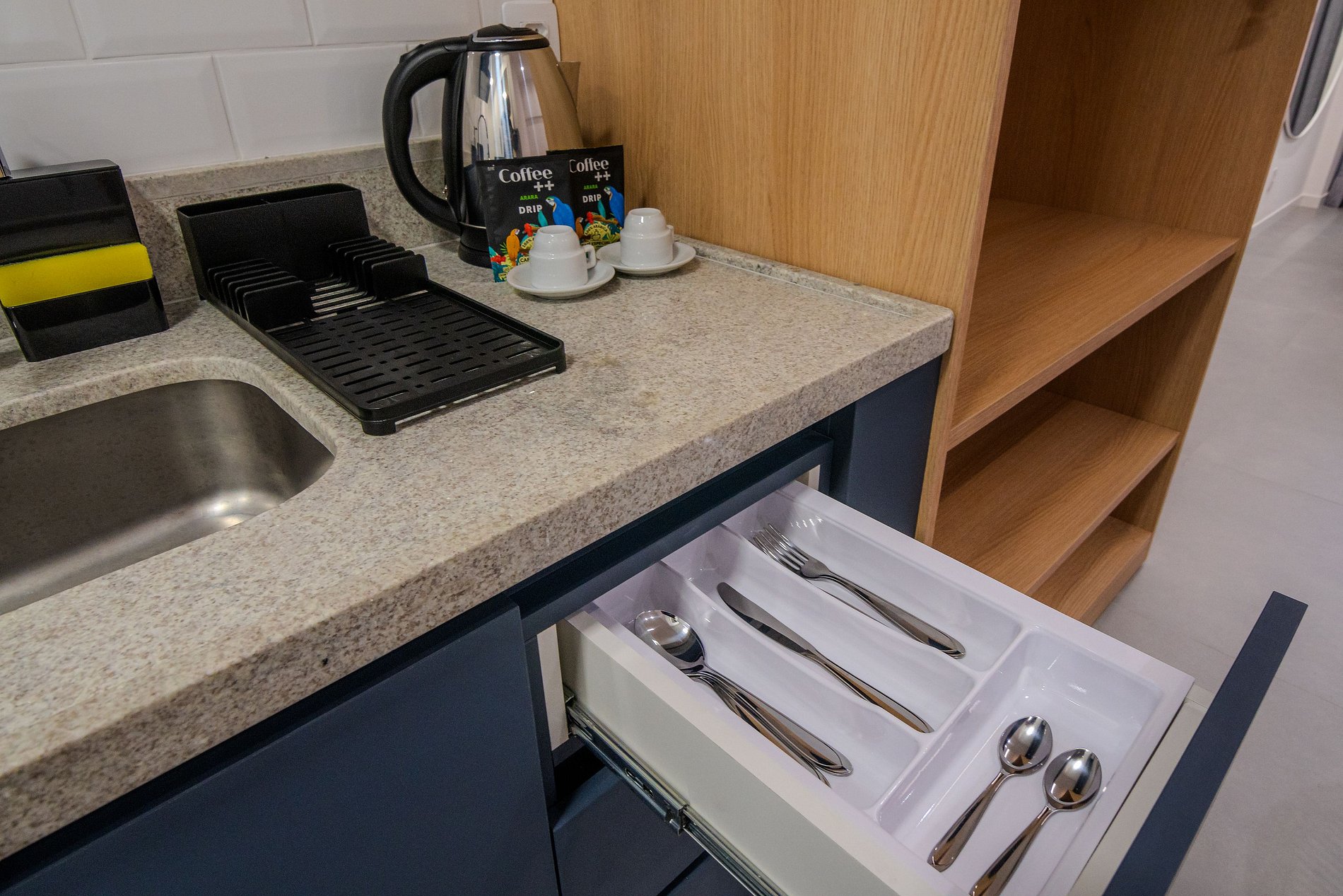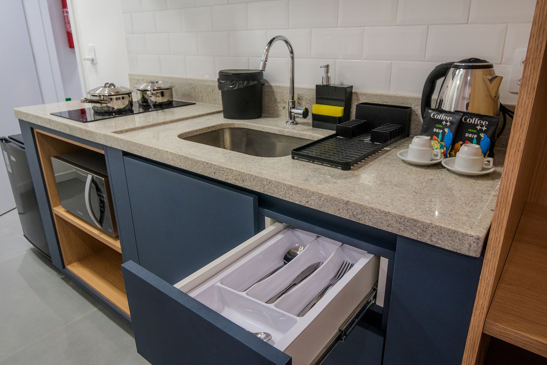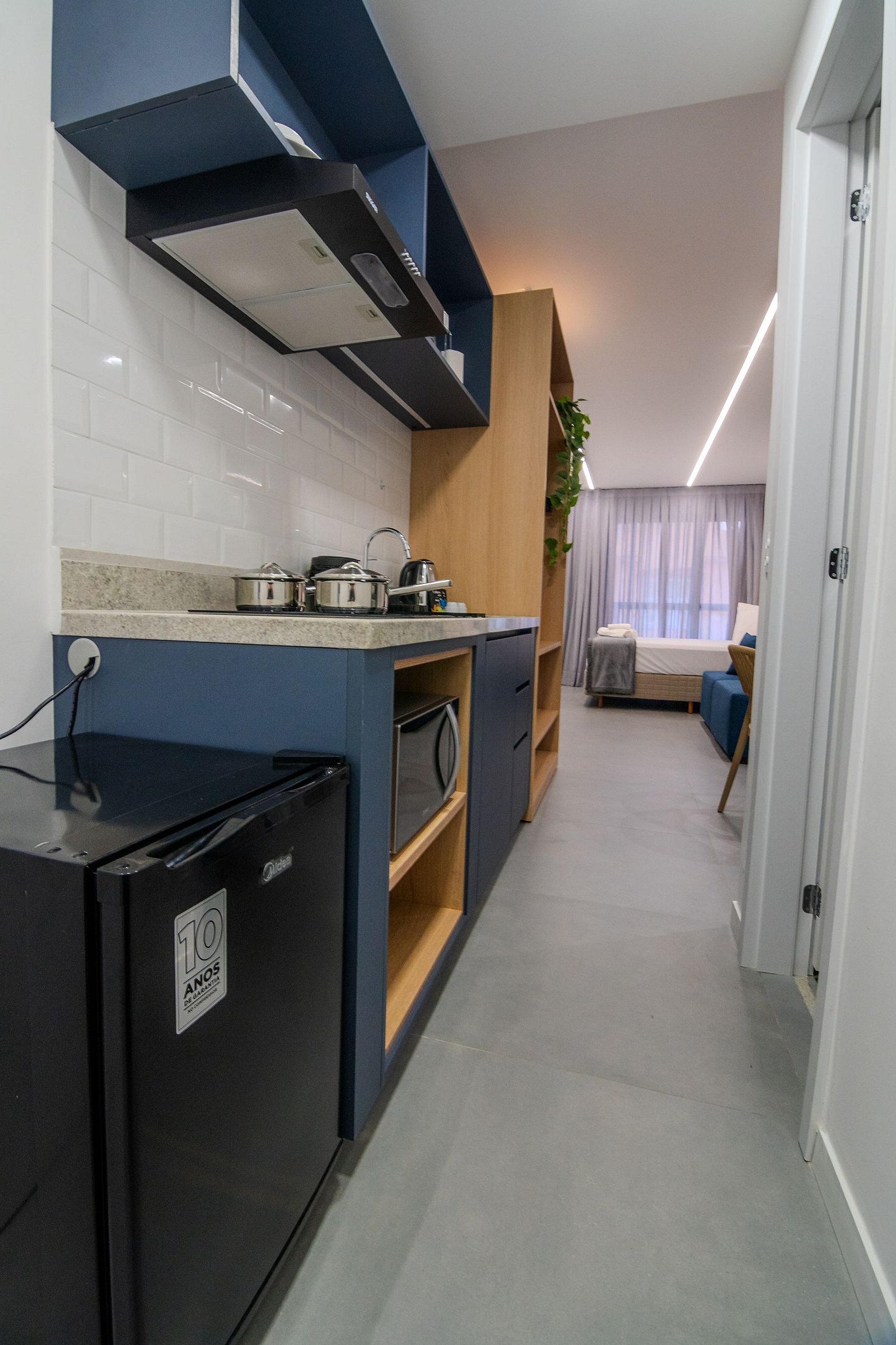 Apartamento executivo com cama queen size, TV de 43”, ar-condicionado, internet wifi e mesa de trabalho. Conta também com sofá e cozinha equipada com fogão de indução de 2 bocas, forno, frigobar, liquidificador, além de panelas, pratos, copos e talheres.
