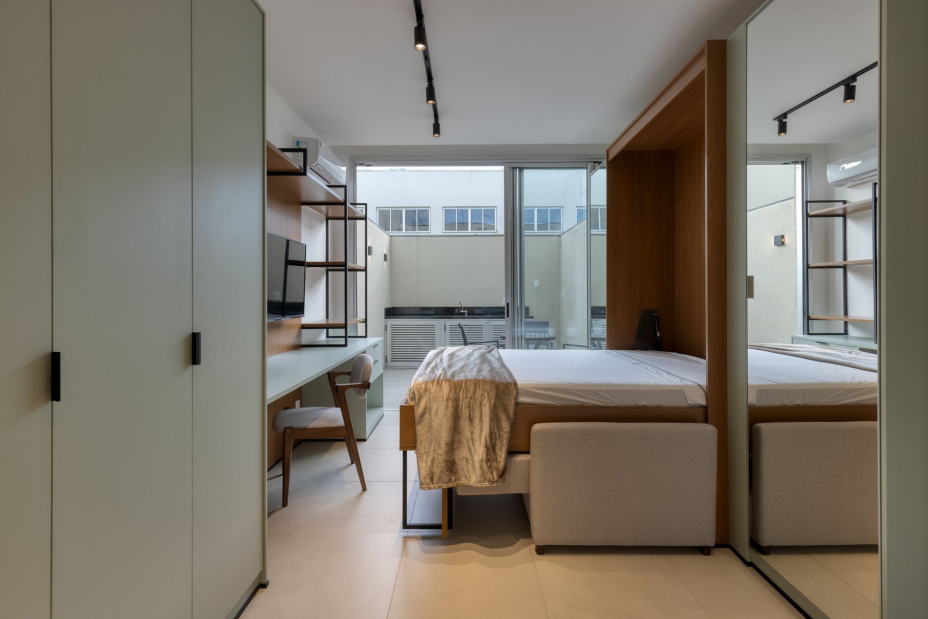 O estúdio possui ar-condicionado, cama retrátil (transforme seu quarto em sala!), frigobar, chaleira elétrica, liquidificador, cooktop de indução, forno elétrico (perfeito para assar um pão de queijo bem mineiro), copos e xícaras. Enxoval completo com roupa de cama e toalhas de banho. Chuveiro elétrico, secador de cabelo e amenities. Em cada andar há uma máquina de gelo. Áreas comuns encantadoras: piscina, sauna, academia, lounge externo, cozinha compartilhada (com mais utensílios, geladeira e micro-ondas), espaço coworking, mini mercado autônomo (pagamento à parte), chopeira, lavanderia compartilhada (pagamento à parte). Self check-in: entrada do prédio por biometria facial. Vaga de garagem inclusa. Possui carregador para carro elétrico.